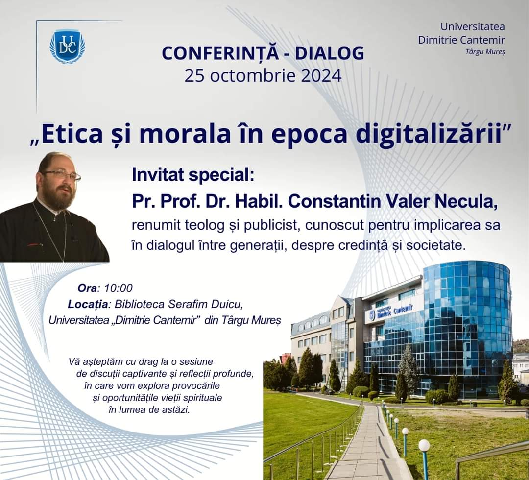 INVITAȚIE. Pe 25 octombrie 2024, Universitatea „Dimitrie Cantemir” din Târgu Mureș va găzdui o conferință-dialog intitulată „Etica și morala în epoca digitalizării”, avându-l ca invitat special pe Pr. Prof. Dr. Habil. Constantin Valer Necula. Evenimentul va începe la ora 10:00, în Biblioteca „Serafim Duicu” și va aborda teme de actualitate legate de provocările vieții spirituale într-o lume tot mai digitalizată.