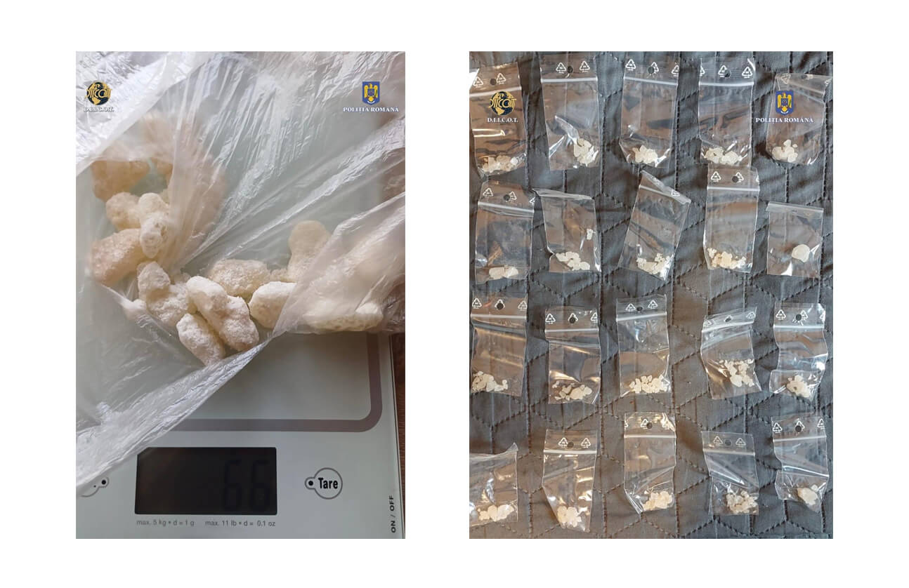 Ulterior, au fost puse în aplicare două mandate de percheziție domiciliară, fiind descoperite și ridicate 20 de plicuri conținând 3-CMC, cunoscut sub denumirea generică de cristal (drog de mare risc), peste 60 de grame de substanță psihoactivă 2MMC, precum și alte mijloace de probă.