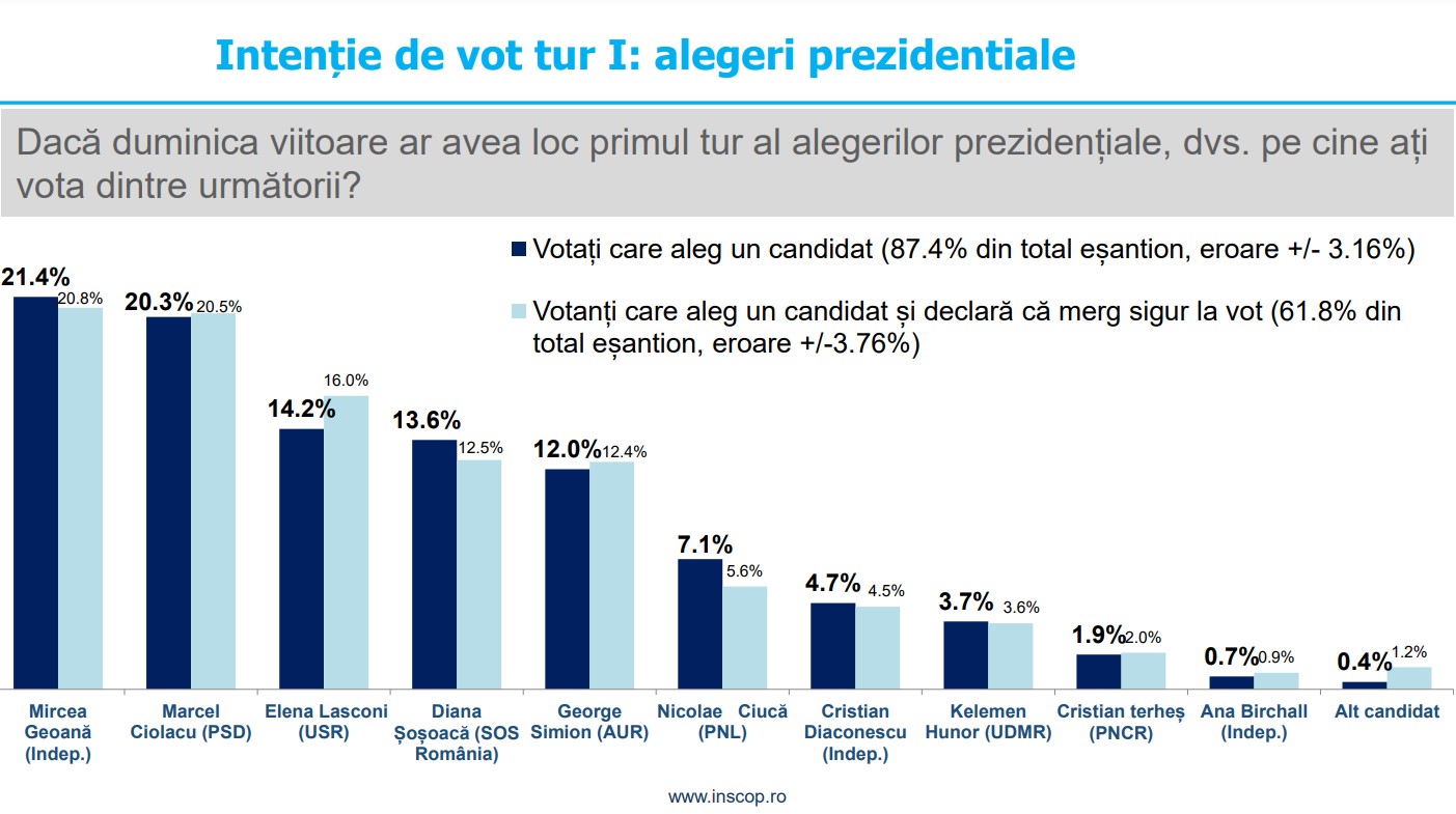 Dacă turul al II-lea ar fi între Geoană și Ciolacu, 47,8% dintre respondenți ar opta pentru Geoană, în timp ce 34,2% l-ar susține pe Ciolacu. În confruntarea dintre Nicolae Ciucă și Elena Lasconi, cele două candidaturi sunt aproape egale, cu 37% pentru Ciucă și 36,7% pentru Lasconi.