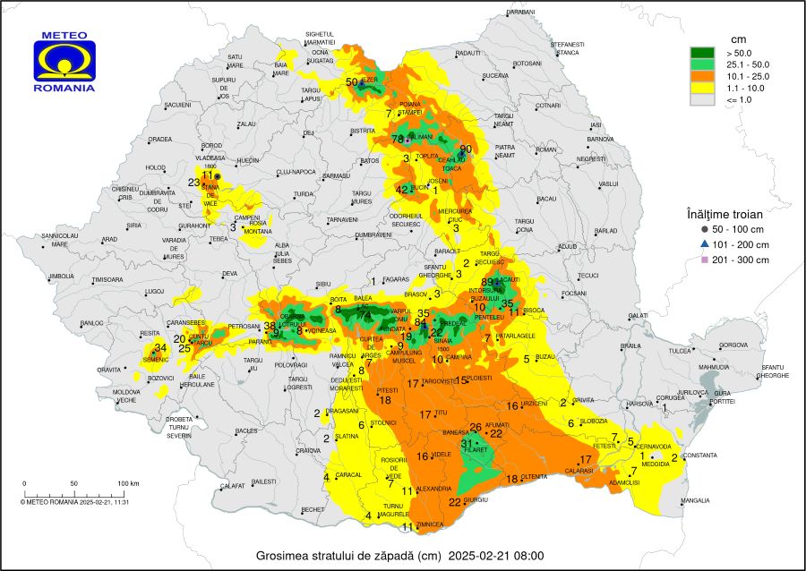 Vineri la ora 8, cel mai gros strat de zăpadă era la stațiile meteo montane Ceahlău Toaca (90 cm), Lăcăuți (89 cm) și Omu (84 cm), arată datele ANM. La stația meteo din munții Călimani și la cea de la Bâlea Lac sunt peste 70 cm.