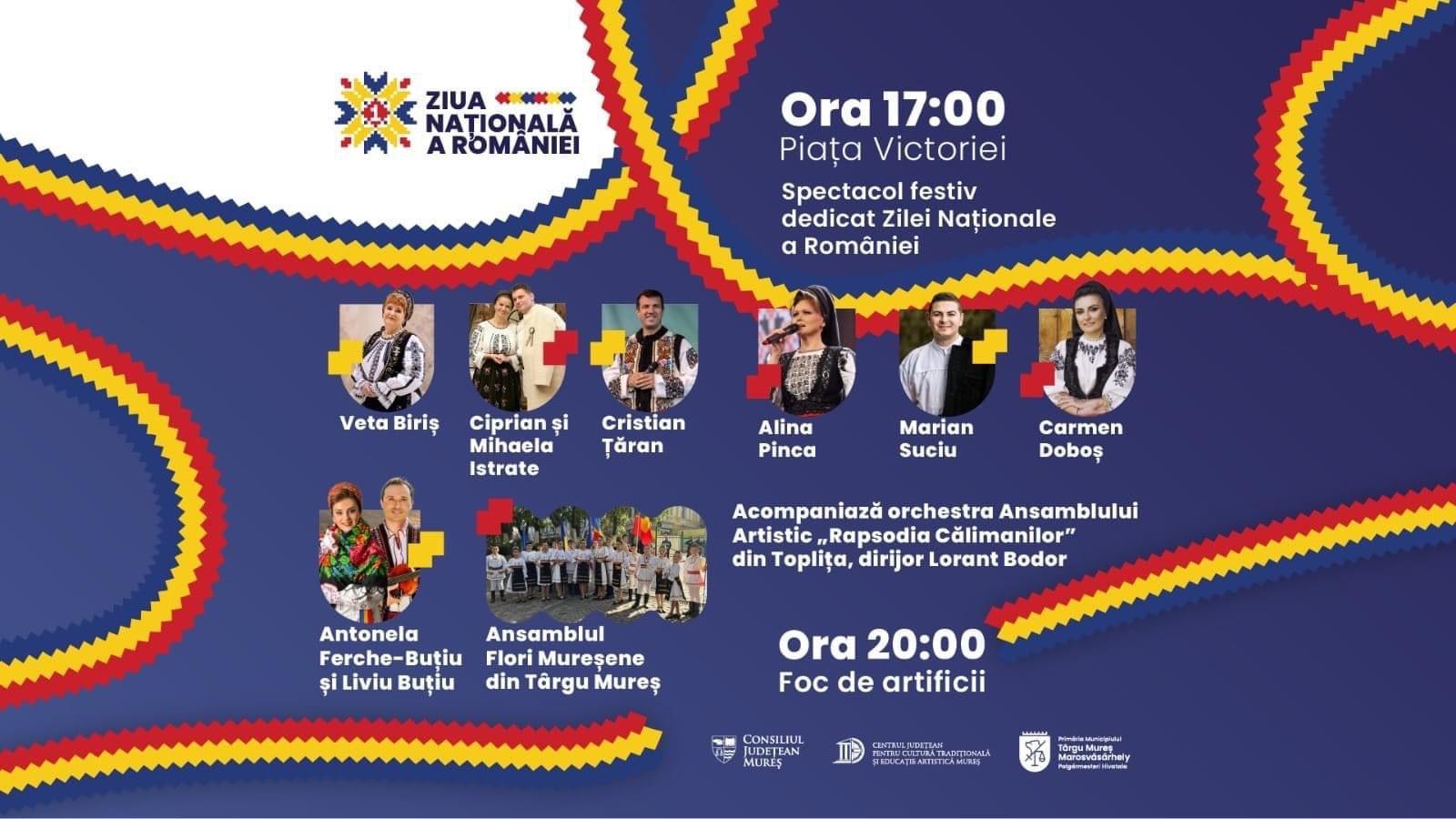 • 17:00:În Piața Victoriei, va începe un spectacol festiv dedicat Zilei Naționale. Evenimentul va debuta cu sunetele tradiționale ale tulnicelor, urmate de prestații ale unor artiști consacrați, printre care: